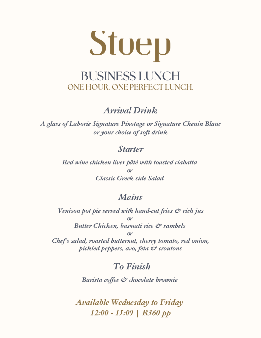 Looking for a quick business lunch in Paarl? Stoep’s three-course Business Lunch is designed for professionals on the go. In and out in just one hour, it’s the perfect balance of quality dining and time efficiency.